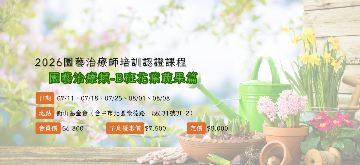 活動課程 園藝治療類 《臺中》2026/07/11-08/08【園藝治療師培訓認證課程│園藝治療類】B班「花葉蔬果篇」 活動日期 : 2026/07/11-08/08 園藝治療類 《臺南》2026/07/04-07/25【園藝治療師培訓認證課程│園藝治療類】B班「花葉蔬果篇」 活動日期 : 2026/07/04-07/25 園藝技術類 《臺北》2026/06/13-06/14【園藝治療師培訓認證課程│園藝技術類】夏季「花之禮讚」 活動日期 : 2026/06/13-06/14 園藝技術類 《線上》2026/05/24【園藝治療師培訓認證課程│園藝技術類】綠巨人系列二:「蜂學問的奧秘—蜜蜂、人與環境之間的關係和重要性」 活動日期 : 2026/05/24 園藝治療類 《臺北》2026/05/09-06/06【園藝治療師培訓認證課程│園藝治療類】A班「保健植物篇」 活動日期 : 2026/05/09-06/06 HT. Club 《臺北》2026/03/29第81次園療俱樂部HT.Club:關於社會處方箋-透過社區參與,共創共好的日常 活動日期 : 2026/03/29 醫療福祉類 《臺北》2026/04/18-04/19【園藝治療師培訓認證課程│醫療福祉類】「杜鵑窩的春天」:精神障礙與精神醫療 活動日期 : 2026/04/18-04/19 園藝技術類 《臺南》2026/04/11-04/12【園藝治療師培訓認證課程│園藝技術類】春季「葉之詩篇」 活動日期 : 2026/04/11-04/12 會前工作坊 / 研討會 (兩場合報-上下午場)2026/04/24第19屆園藝治療國際研討會-會前工作坊:花連處、樹慢箋:園藝治療在綠色處方箋的實踐 活動日期 : 2026/04/24 會前工作坊 / 研討會 (單場報名-下午場)2026/04/24第19屆園藝治療國際研討會-會前工作坊:花連處、樹慢箋:園藝治療在綠色處方箋的實踐 活動日期 : 2026/04/24 會前工作坊 / 研討會 (單場報名-上午場)2026/04/24第19屆園藝治療國際研討會-會前工作坊:花連處、樹慢箋:園藝治療在綠色處方箋的實踐 活動日期 : 2026/04/24 會前工作坊 / 研討會 (大會套裝組合)2026/04/25-26第19屆園藝治療國際研討會暨國內論壇 活動日期 : 2026/04/25-04/26 會前工作坊 / 研討會 (單場報名 - 國內論壇)2026/04/25-26第19屆園藝治療國際研討會暨國內論壇 活動日期 : 2026/04/26 會前工作坊 / 研討會 (單場報名 - 國際研討會)2026/04/25-26第19屆園藝治療國際研討會暨國內論壇 活動日期 : 2026/04/25-04/26 園藝技術類 《線上》2026/03/28【園藝治療師培訓認證課程│園藝技術類】綠巨人系列一:「從土地到餐桌:具有療癒特質的香草與香料」 活動日期 : 2026/03/28 醫療福祉類 《臺中》2026/03/21-03/22【園藝治療師培訓認證課程│醫療福祉類】「他不重他是我家人」:特殊教育與身心障礙 活動日期 : 2026/03/21-03/22 園藝治療類 《臺北》2026/03/14-03/15【園藝治療師培訓認證課程│園藝治療類】C班「戶外篇」 活動日期 : 2026/03/14-03/15 園藝技術類 《臺北》2026/03/07-03/08【園藝治療師培訓認證課程│園藝技術類】春季課程「葉之詩篇」 活動日期 : 2026/03/07-03/08 課程表 2026園藝治療師培訓認證課程表 活動日期 : 2026/1~2026/12 活動花絮