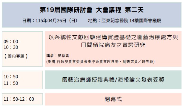 (單場報名 - 國內論壇)2026/04/25-26第19屆園藝治療國際研討會暨國內論壇